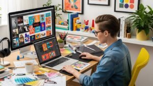Graphic design is a popular freelancing skill for creative individuals. Graphic designers create logos, social media posts, banners, thumbnails, and branding materials for businesses.